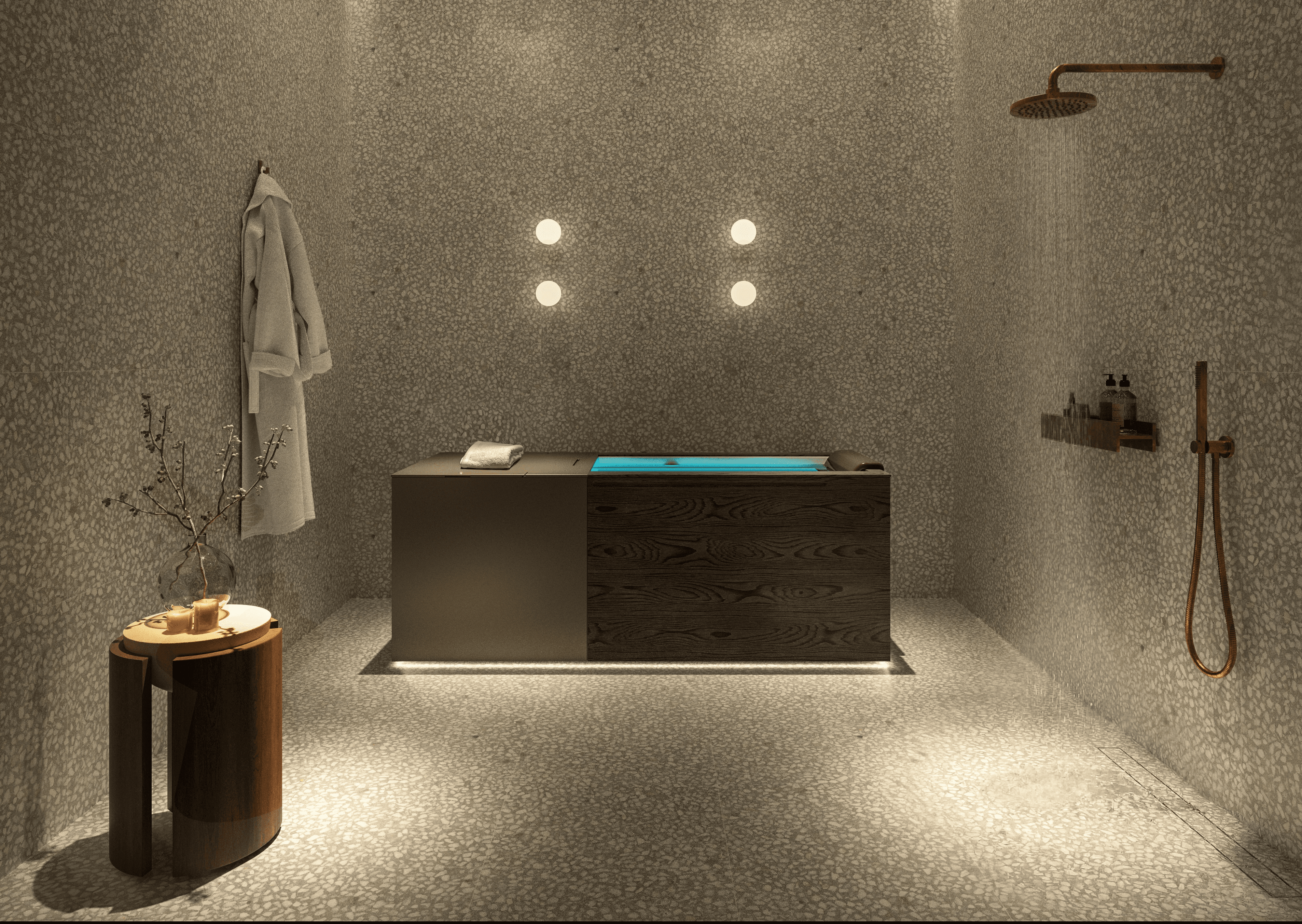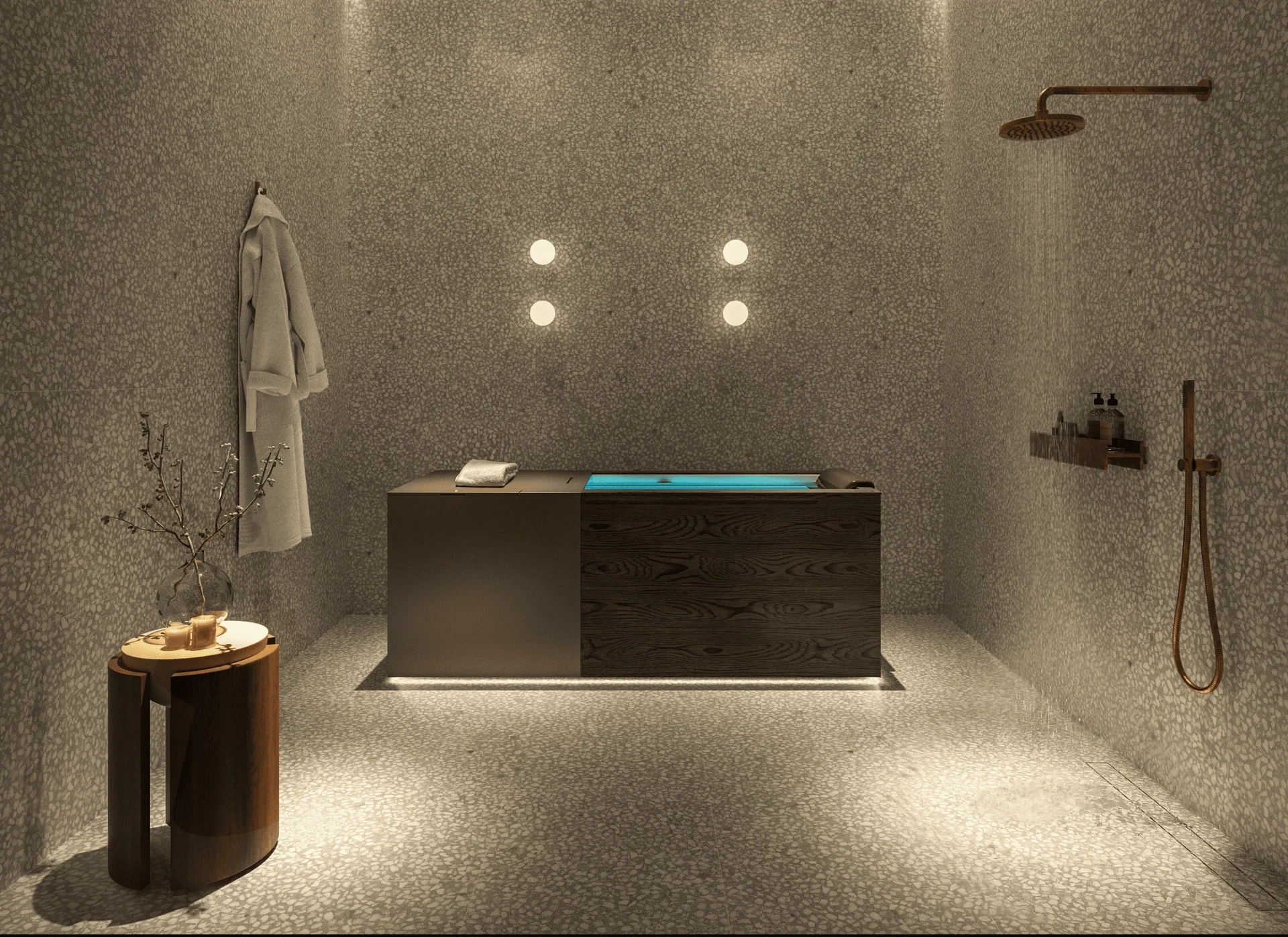 Step into shadow and stillness. The sauna, ice bath, and treatment room exist within a cocoon of deep tones that recall oceanic depths. Every surface is chosen for its ability to quiet the mind.