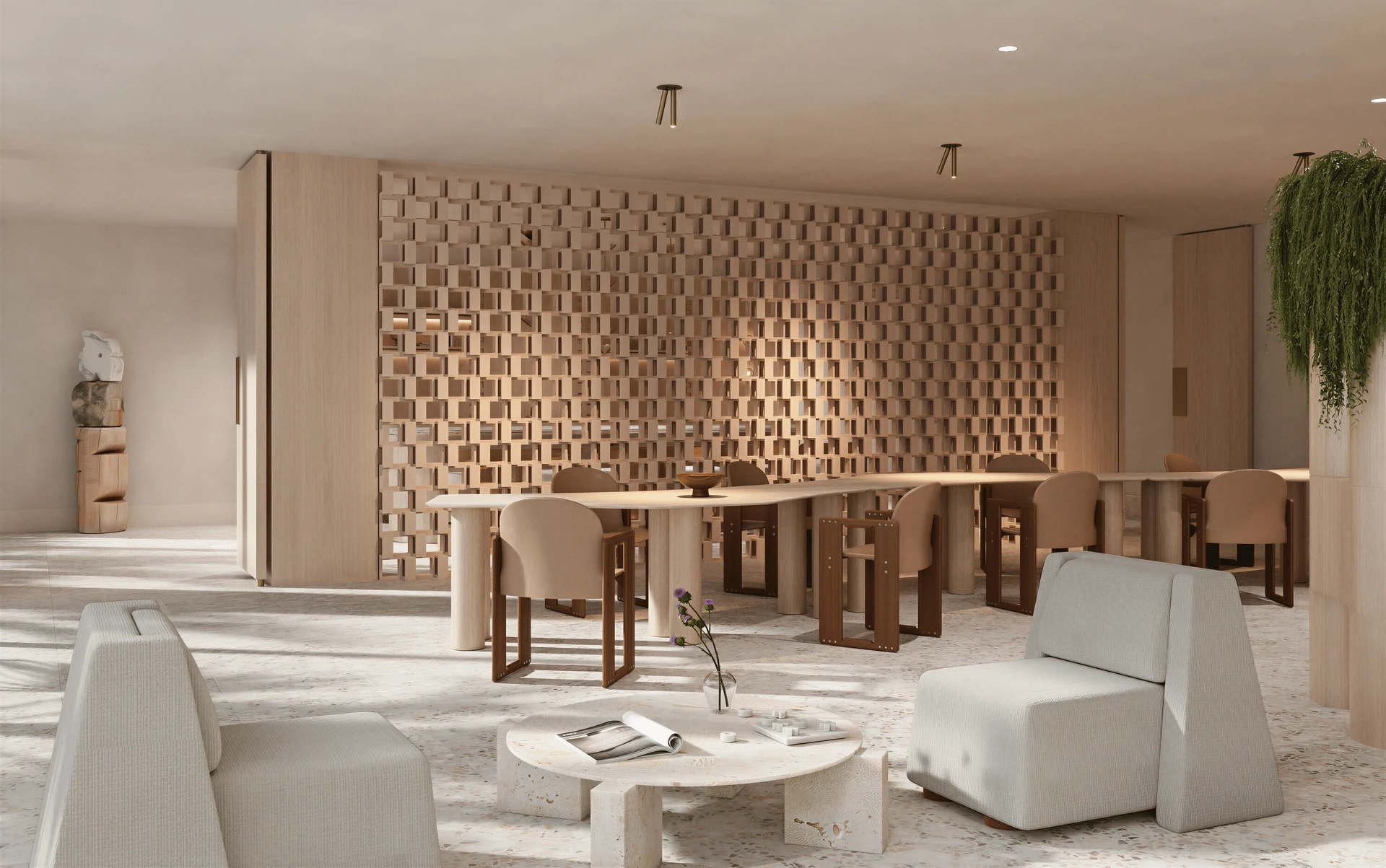 The first impression unfolds through material and light. Coral stone anchors the space while pecky cypress and jute soften the edges. Pearl-toned upholstery on sculptural seating creates an arrival that feels both artful and welcoming.
