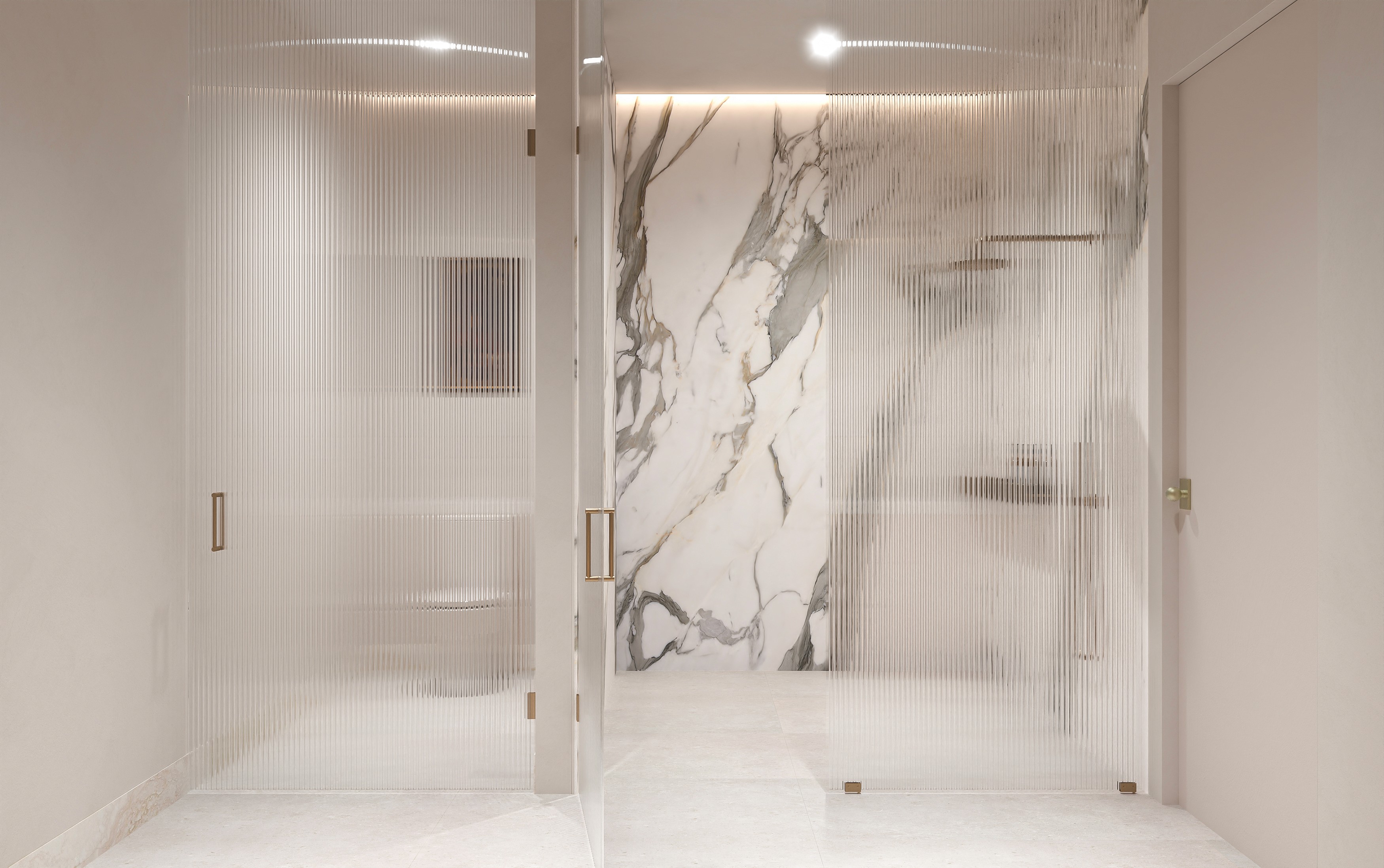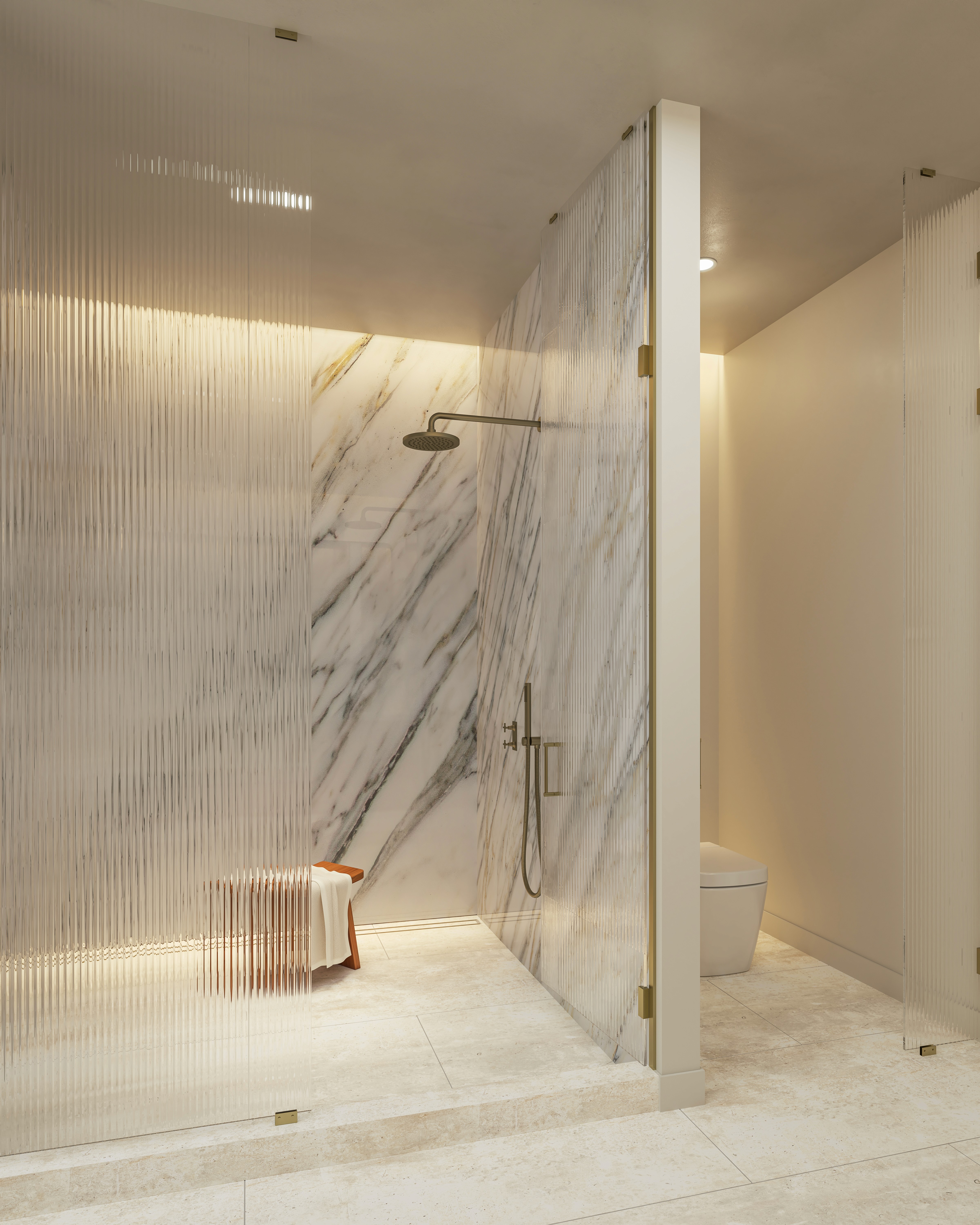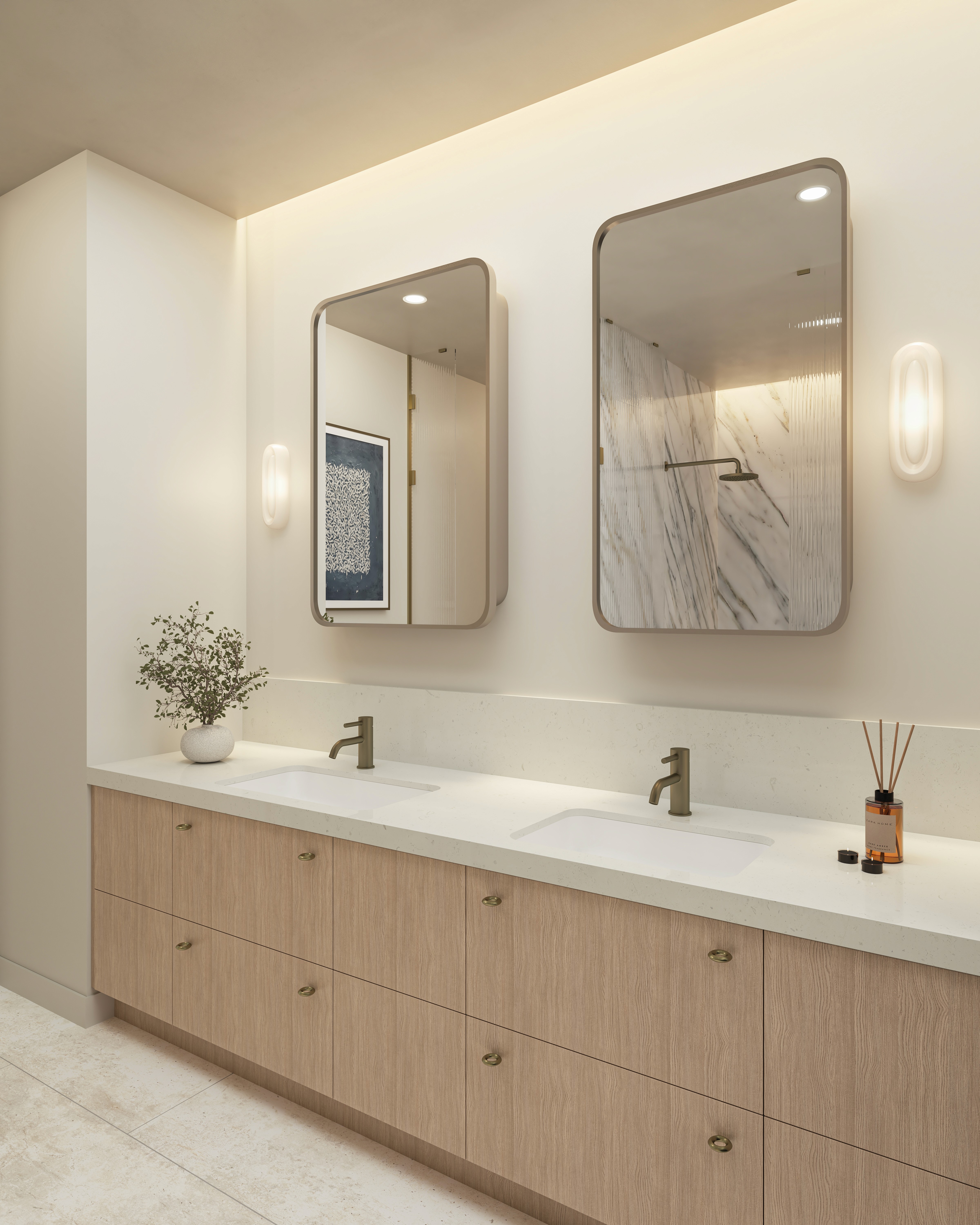 Full-height feature walls composed of richly veined, large-format porcelain tiles that serve as the sculptural touchpoint in beautifully designed bathrooms that exude calmness and privacy. Seamless large-format porcelain slab flooring anchors the space. Light-diffusing textured glass partitions, polished metal fixtures, curved mirrors, and architectural niches with integrated lighting are sophisticated touches that add to the overall ambiance. Custom vanities come with premium stone and wood surfaces, and free-standing architectural soaking tubs are available in select units.