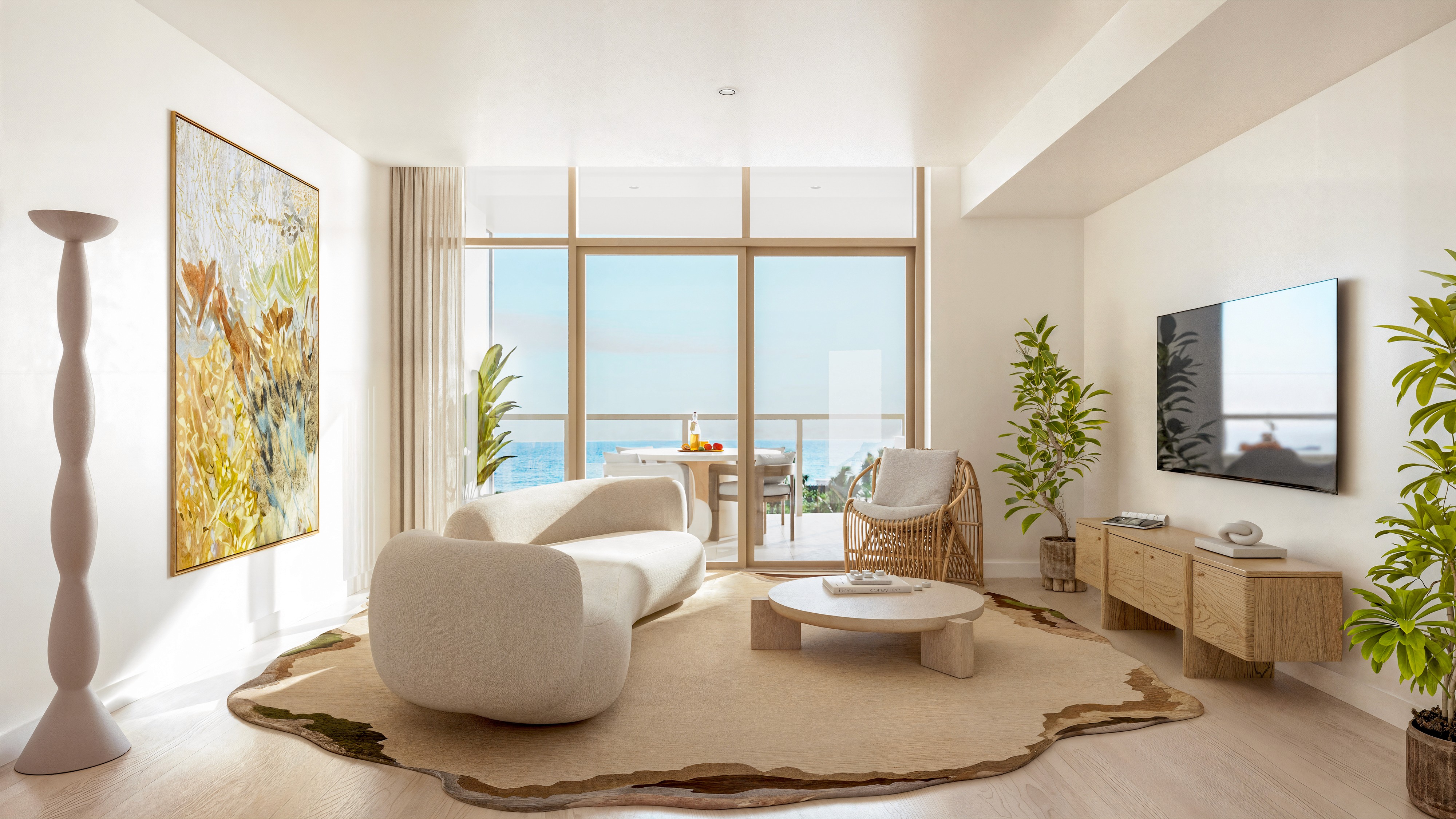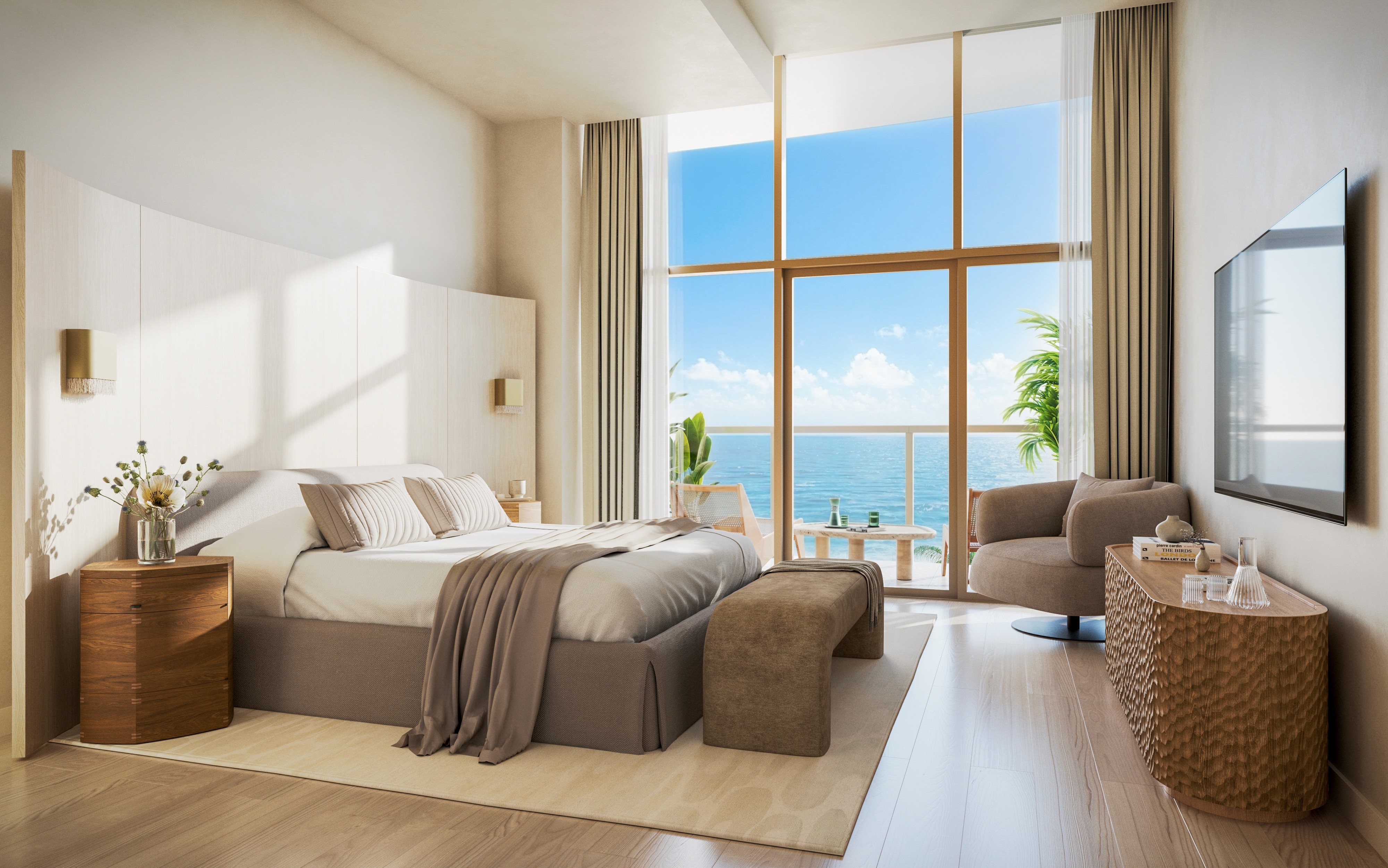 Welcoming open-plan bedrooms and living areas with wood flooring create calming spaces to entertain and lounge. Beyond, expansive wraparound terraces with ocean-inspired curves beckon, complete with summer kitchens for a villa-in-the-sky experience.