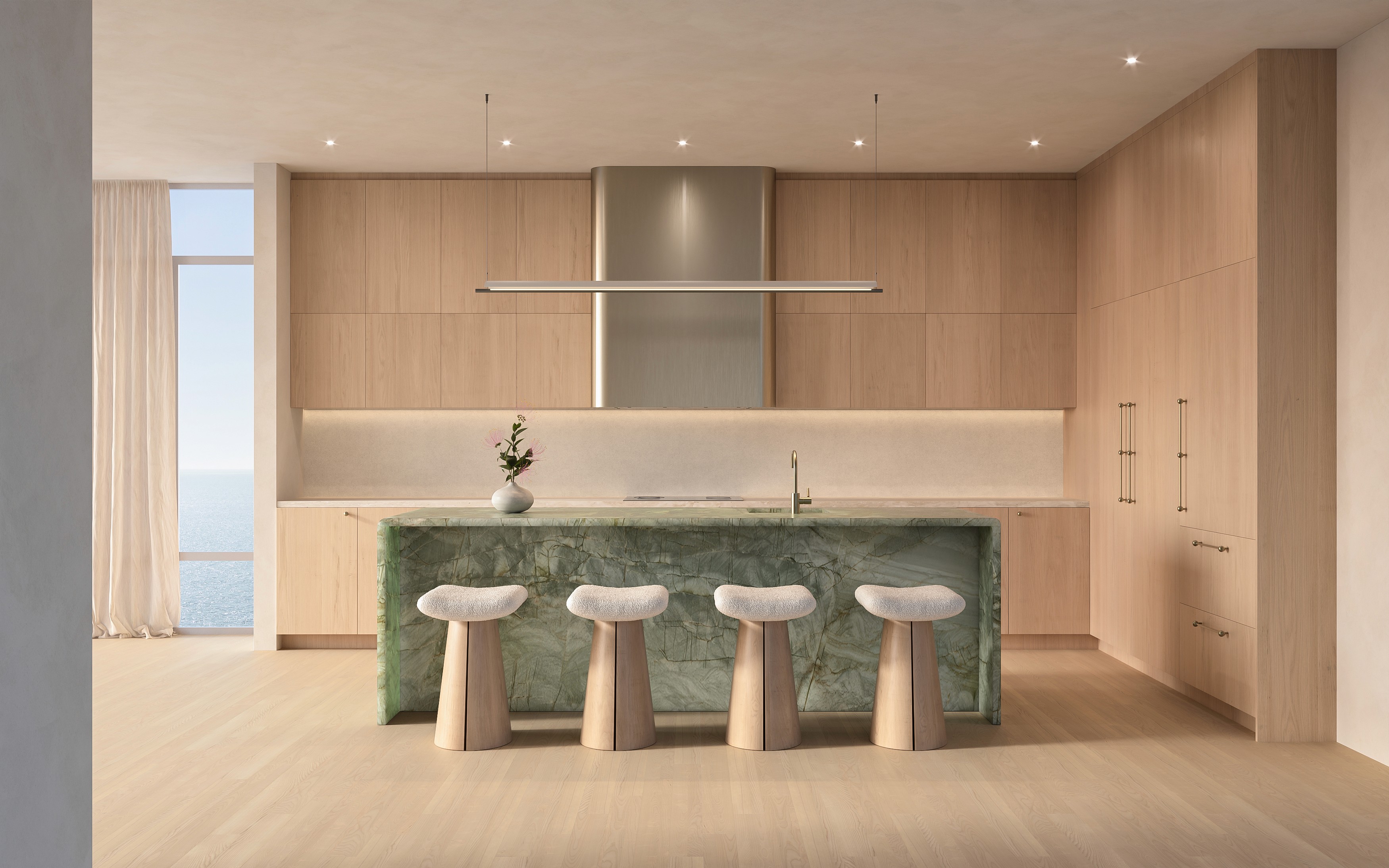 Choose between two distinctive kitchen designs, each crafted to elevate your culinary experience. Two kitchen designs offer an exciting customization option, allowing you to choose an aesthetic aligned with your personal tastes. Anchoring the spaces are bold sculptural stone islands or peninsulas with subtle vertical detailing. Premium stone backsplashes transition across walls and behind open shelving with soft internal illumination. Warm wood-veneer cabinetry in natural coastal tones features minimalist hardware and concealed storage for a refined look. Gaggenau appliances are fully integrated, while every private terrace includes a summer kitchen.